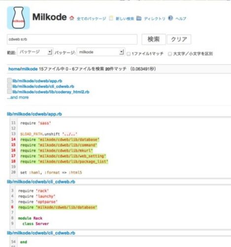 暑くなりましたね、Milkode0.9をリリースしました。Webアプリの使い勝手向上が主な修正点です。サジェスト検索、パッケージセレクタ、ダイレクトジャンプといった新機能が入り、直感的に検索出来るようになりました。 デモアプリでは試しにmruby等のソースコ…