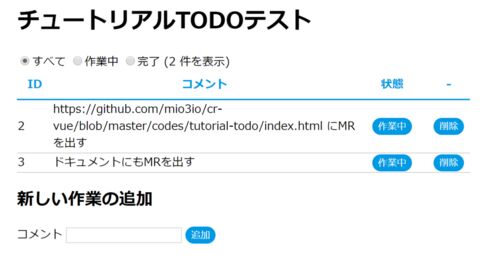 前回からの続き。 次は定番のTODOリストを作る。 ToDoリストを作りながら学習しよう! | 基礎から学ぶ Vue.jsを進める。 できた。 https://github.com/ongaeshi/tutorial-todo こんな感じになる。 結構いい出来。もう少し調整したら普段使いのTODOリストとし…