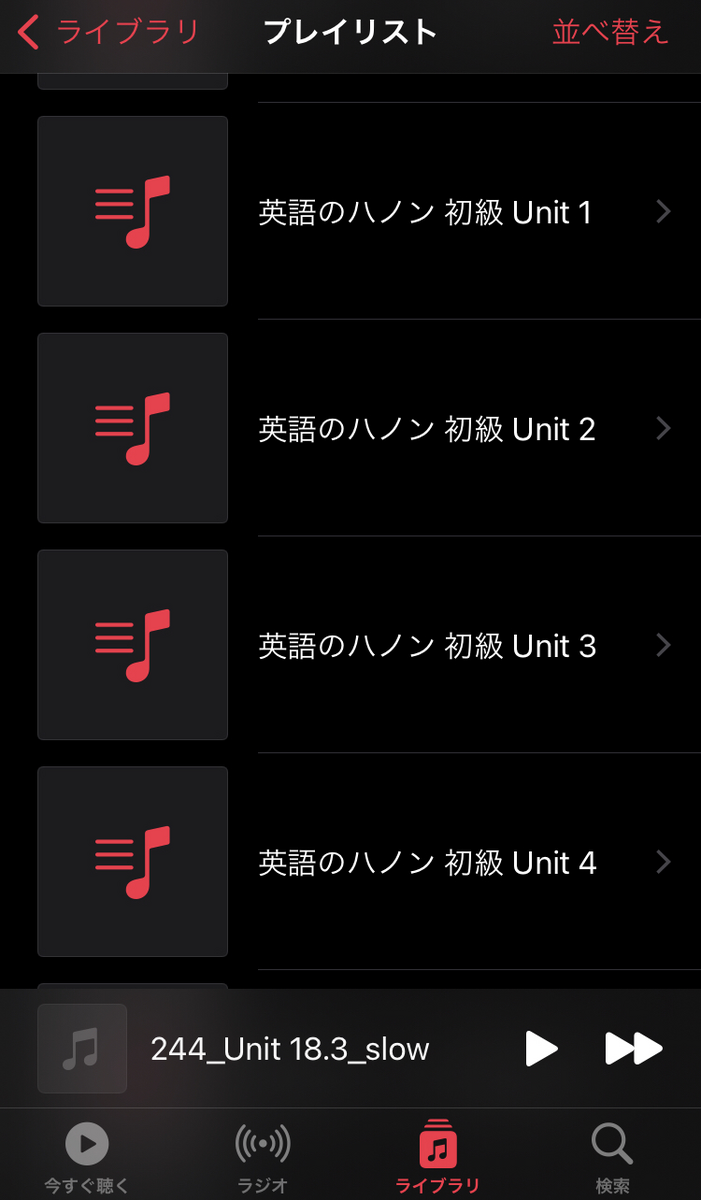 まとめとしては、面倒だけどちゃんと音声をミュージックアプリに入れてプレイリストを作って毎日少しずつやりましょうという話になります。当初は PC 経由するのが面倒で iCloud に mp3 置いて直接再生でやってたりしていたけど、ある程度再生機能が充実していないとやりにくいので最初に頑張って iTune を PC にインストールしましょう。