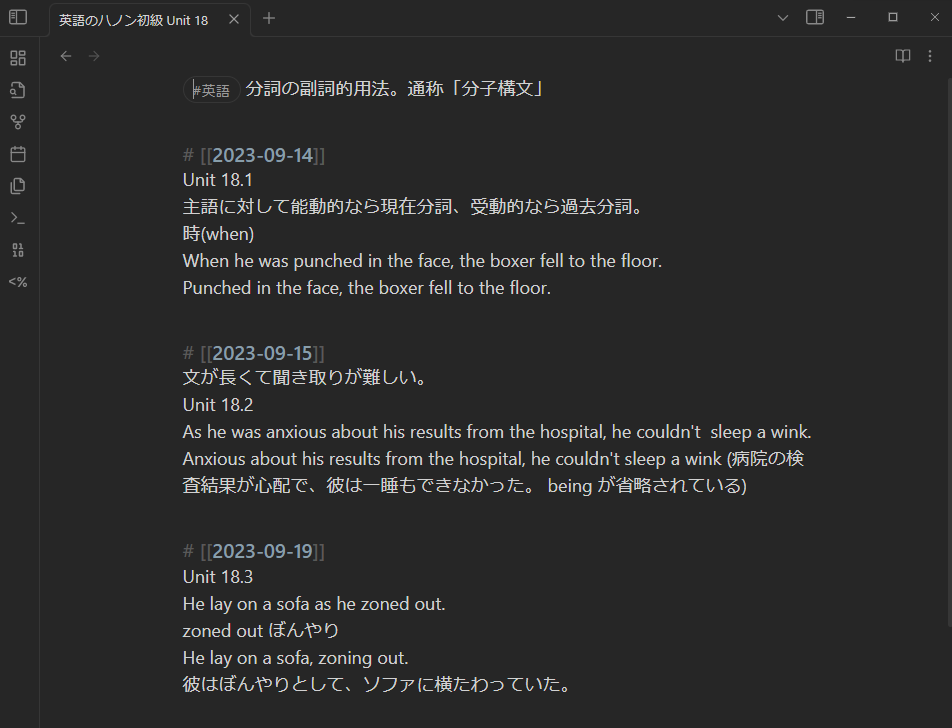 記録を付ける。Obsidian に日付とやった Unit をその日に印象に残ったことをメモ。 メモを読み返すと全部の Unit をやるのに半年位かかっていた。